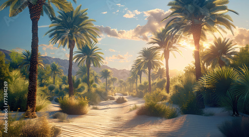 A desert oasis with palm trees and a clearing in the middle, morning light. Generative AI.