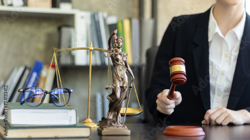 judge holds givel wood tapped on the wooden base to read verdict for victims and defendants to know the verdict obtained from the evidence and the lawyer's defense of the case. court decision concept