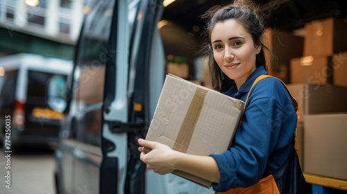 Repartidor o transportista cogiendo un paquete de una furgoneta