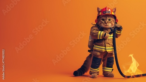 Cat dressed as firefighter stands heroically with fire helmet and hose against orange background