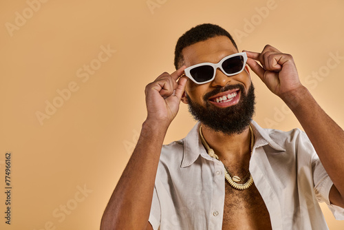 A man with a stylish beard and trendy sunglasses exudes confidence and charisma as he poses for the camera.