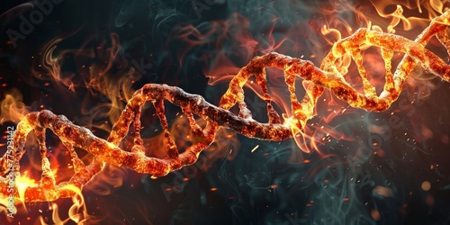 DNA helix ablaze, fire meeting genetics in a symbolic dance of creation