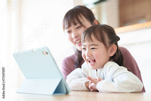 タブレットを楽しむ女の子とお母さん