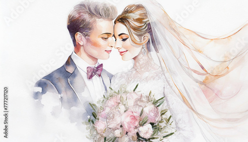 Portret młodej pary. Rysunek, szkic, akwarela ze złotymi elementami. Zaproszenie lub kartka ślubna