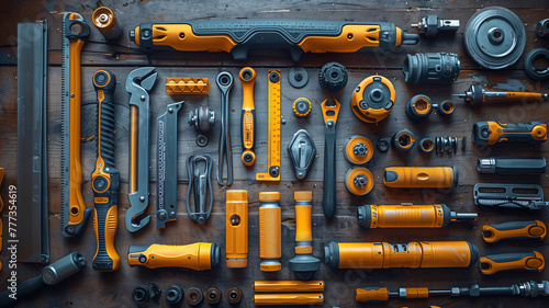 tools organized in a standardized way, knolling type, in black and yellow on a dark background