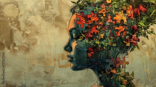 Graphic novel panel with a person of puzzle pieces, each detailed in comic shading, showing emotions linked to food dramatically. Emotional OverEating Awareness Month