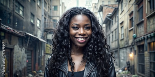 portrait of happy black fashion woman with long hair in ghetto backdrop