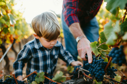 Father and son harvesting grapes in vineyard. Selective focus