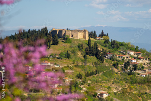 Spring scenery in the area of Canal and Fanari in Greece, consisting of pink flowers, buildings and the ancient castle.