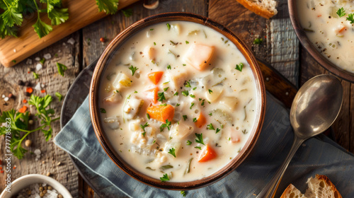 Bowl of classic irish seafood chowder garnished with parsley, rustic style