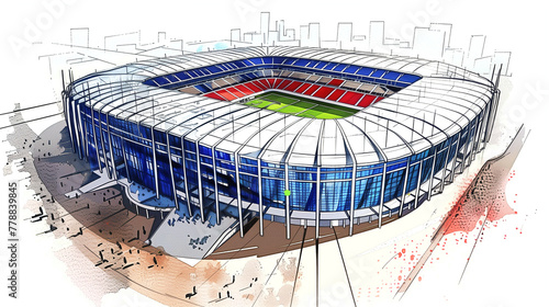Sketch of the studium Parc des Princes in Paris with some watercolor elements in the French flag colors.