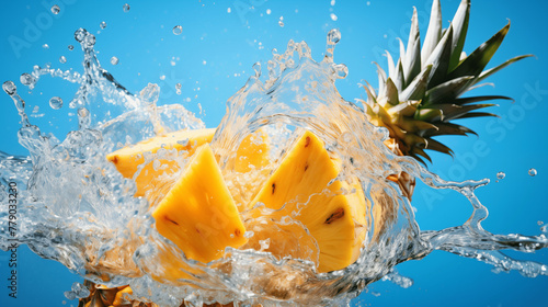 Morceaux de fruits, ananas sur un fond bleu avec éclaboussure d'eau. Fruit, sain, délicieux, sucré. Jus de fruit, dessert. Pour conception et création graphique.