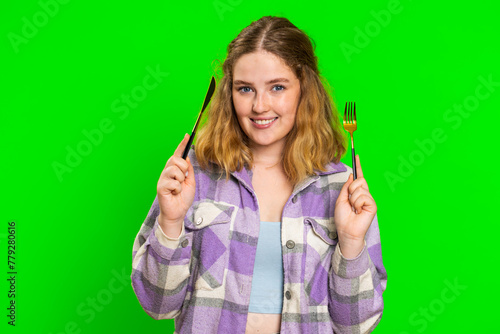 Ready to eat. Hungry young woman waiting for serving dinner dishes with with restlessness holding cutlery fork knife, will appreciate delicious restaurant meal. Girl isolated on chroma key background