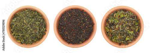 Set tea, Sencha green tea, Black Darjeeling and White Pai Mu Tan dried tea leaves in clay pot isolated on white, top view