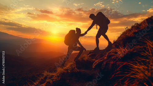 People helping each other hike up a mountain at sunrise. Giving a helping hand,