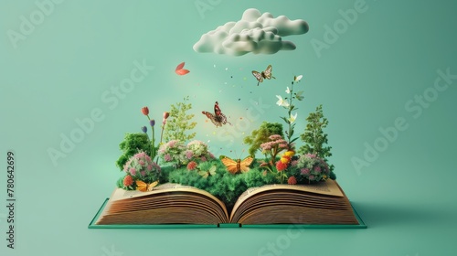 Fantasy and literature concept. 3D style Illustration of magical book with fantasy stories inside it. The concept for World Book Day background with copy space. Beautiful background.