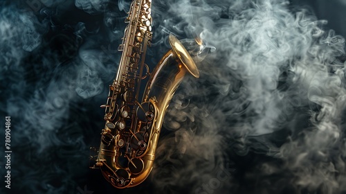 Golden shiny alto saxophone on black background with smoke. copy space