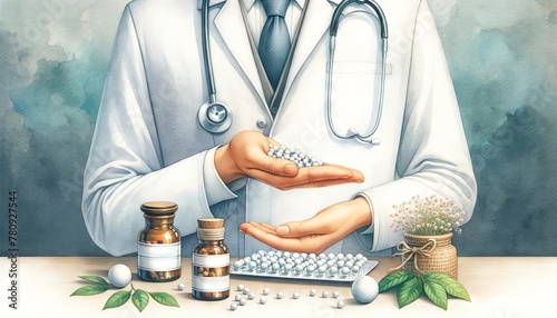 Digital art of Doctor Homeopath with homeopathy medicine bottle. Hand displaying homeopathic globules. Concept of homeopathy, alternative medicine, organic apothecary, naturopathy