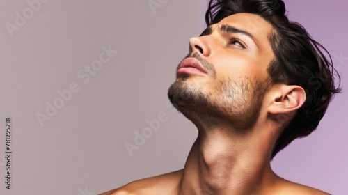 Handsome Young Man with Stubble Gazing Up Thoughtfully on Purple Background.