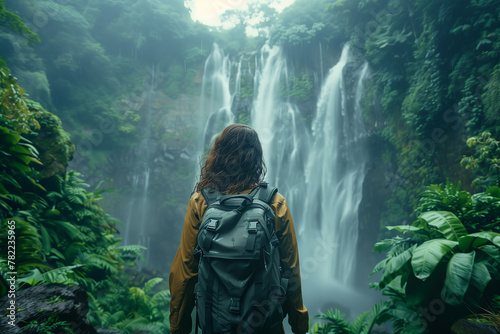 A traveler hiking through lush green forests to discover hidden waterfalls. A woman with a backpack stands by a jungle waterfall