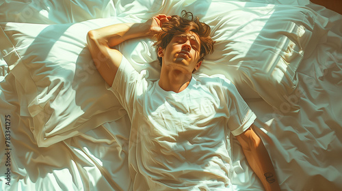 Tableau d'un jeune homme châtain en T-shirt blanc endormi dans son lit, les rayons du matin illuminent les draps