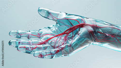 3D style X-Ray Transparent Hand Scan with Visible Red Veins and Red Thread.