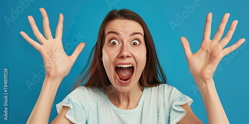 photo of excited woman with open mouth and wide eyes looking at camera, generative AI