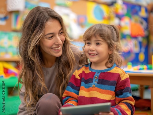 Fotografia de uma professora sorrindo ao lado de crianças da escola, transmitindo alegria e carinho. Esta imagem captura o vínculo especial entre educadores e alunos