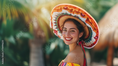 Smiling beautiful hispanic young woman wearing a typical traditional hat posing at a town celebration party