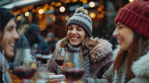 Winter couple enjoying park with Christmas lights, smiling women and children, fashion on city streets, happy people at bar, festive night