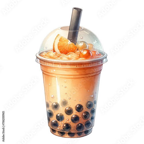 A cup of orange bubble tea with black tapioca pearls on transparent background.
