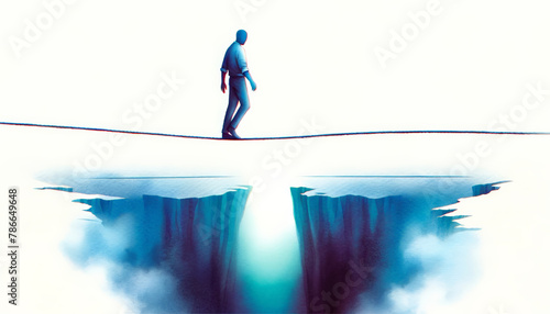 Conceptual image of a person tightrope walking over a precipice, depicting risk, challenge, and determination, ideal for business and motivational themes