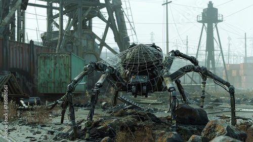 A giant mechanical spider made of scrap metal stands in an abandoned industrial shipyard