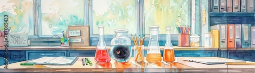 A watercolor painting of a science project that accidentally creates a mini black hole in a classroom, sucking in pencils and notebooks