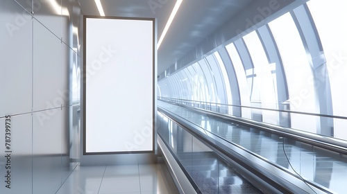 An empty billboard mockup next to a travelator in a modern airport arrival area a white blank poster template indoors of a terminal of public transport building or shopping mall near a : Generative AI