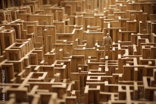 Desperate Lost man in wooden tangled maze. Confused disoriented guy in the middle of labyrinth. Generate ai