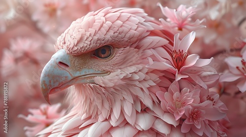 A majestic bald eagle with pink feathers stands tall in a field of cherry blossoms.