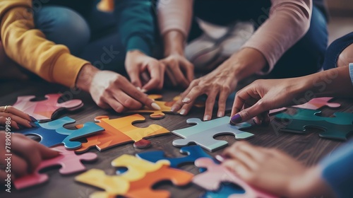 Company employees playing game and joining pieces of jigsaw puzzle during team building activity