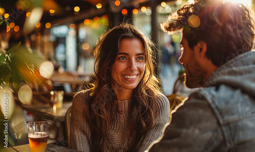 Romantic Alfresco Date Night: Charismatic Man Entertaining Charming Woman with Captivating Stories on Cozy Terrace