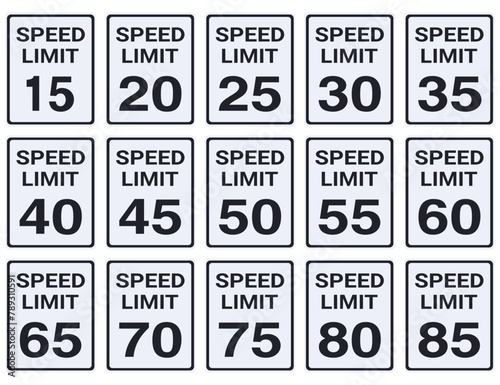 Collection of USA speed limit signs from 15 to 85 mph in flat style (cut out)