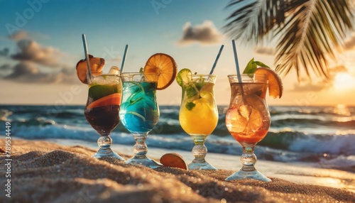Drinki stojące na plaży na piasku. W tle widać morze i zachód słońca. Wakacyjne tło