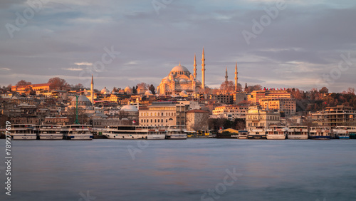 Mosque near the river in Istanbul at sunrise