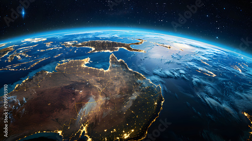 A cosmic sight of our home planet. with glowing lights marking dense cityscapes and main biomes such as ponds