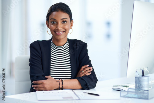 Lawyer, portrait and smile with office, confidence and working for professional law firm. Woman, technology and corporate employee with computer, information folder and ambition for startup agency