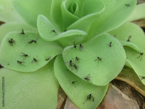 Zbliżenie na roślinę owadożerną z gatunku pinguicula pokrytą małymi muszkami