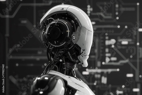 A majestic robot, standing tall and powerful, exuding a sense of strength and modernity in black and white.