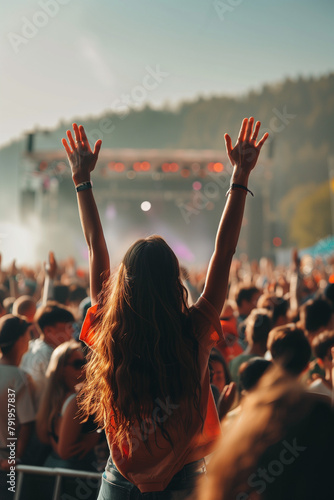 crowd at the concert summer music festival. Back view of a young woman with hands in the air. High quality photo