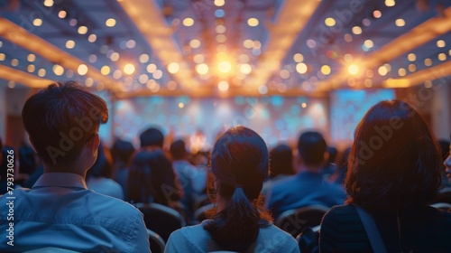 Attentive audience in dimmed hall focuses on speakers, engaging in a corporate event.