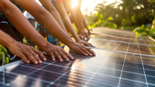 Community Members Collaborating to Install Solar Panels on a Community Center Rooftop