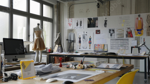 A room with a mannequin and a wall of sketches